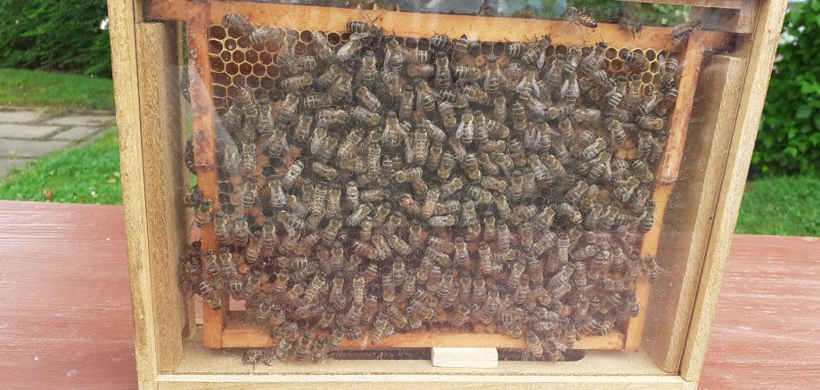 Erbach. Im Juni bekam die Kita Mobilé Besuch von einem Imker. In einem Schaukasten konnten die Kinder eine Bienenkönigin und das Bienenvolk betrachten. Die Kinder zeigten sich sehr interessiert, auch als sie eine von den Bienen hergestellte Wabe und den Honig aus der Wabe probieren durften.