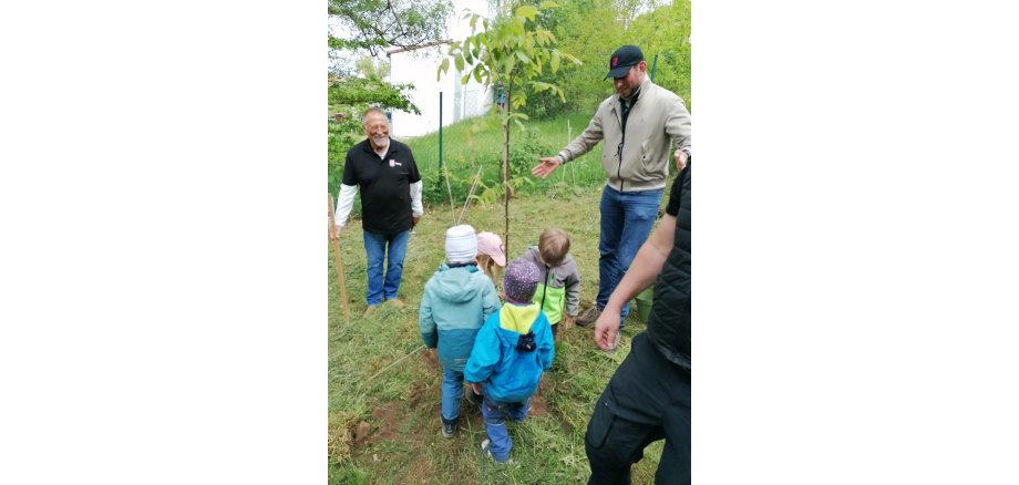 Mitglieder des Stammtisch 18 besuchten die einzelnen Einrichtungen und pflanzten die Bäume mit den Kindern ein.